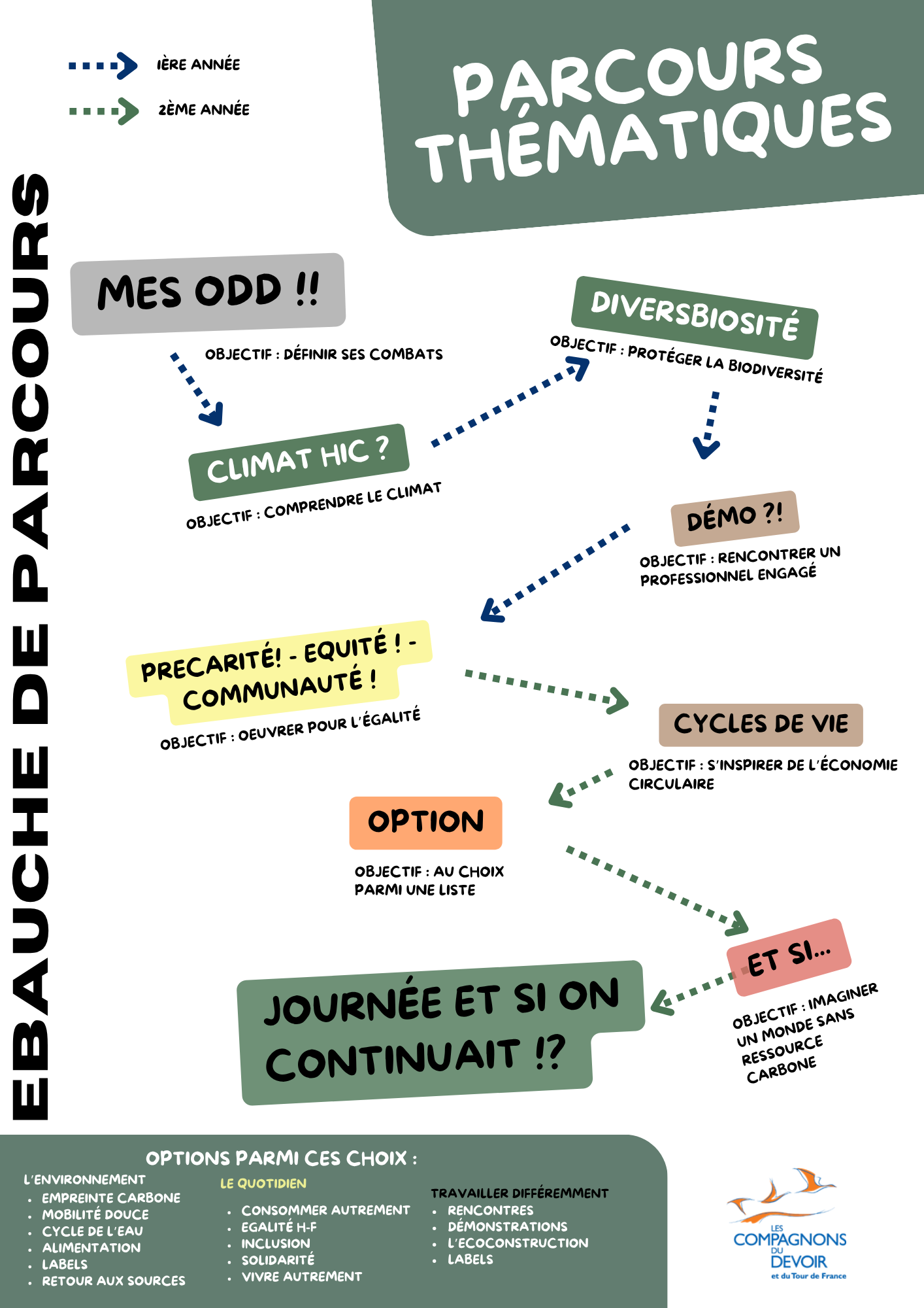 Le parcours thématique se compose d'une série d'ateliers indépendants les uns des autres. L'objectif global est de développer une culture de base autour des principaux enjeux sociétaux contemporains.