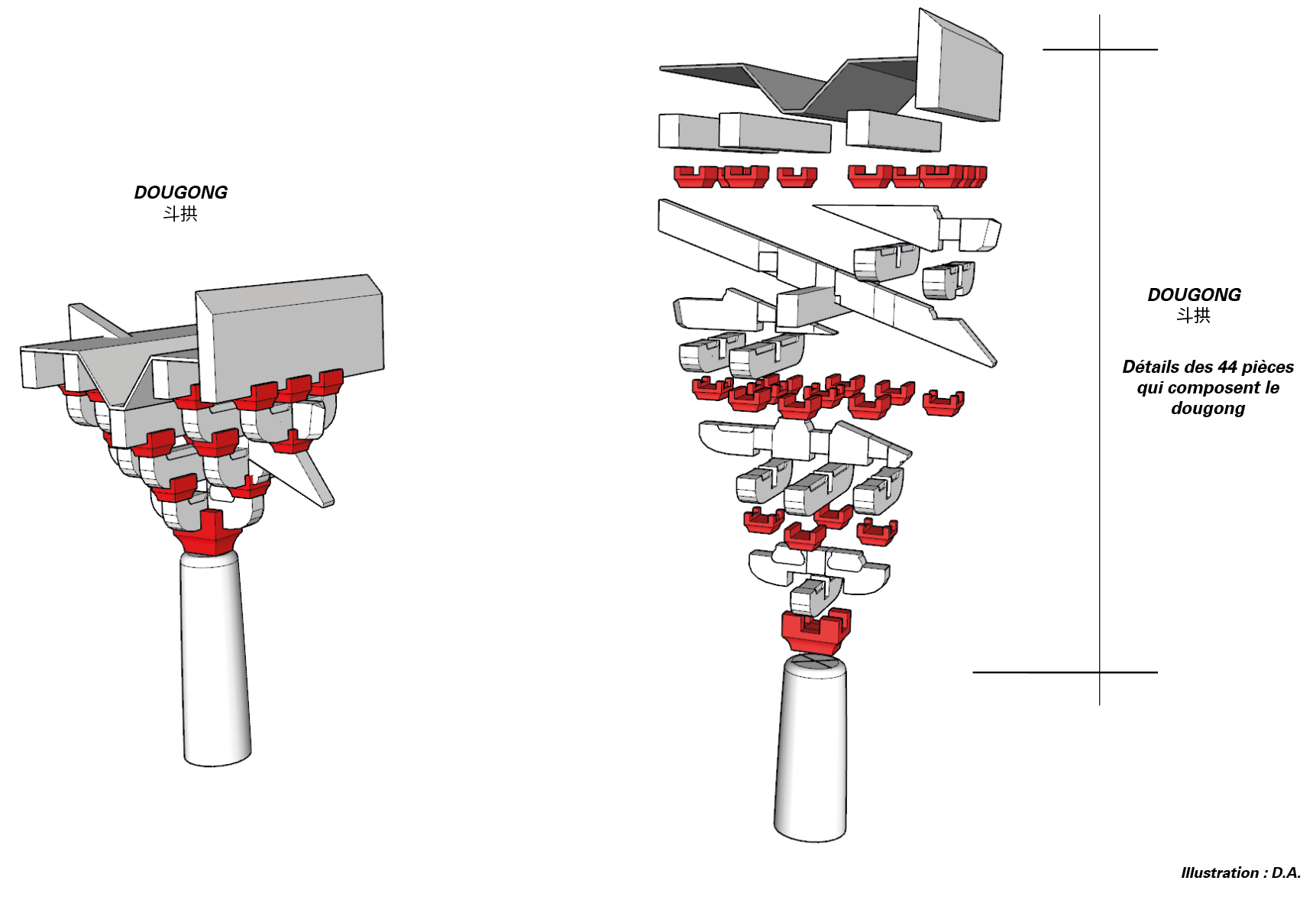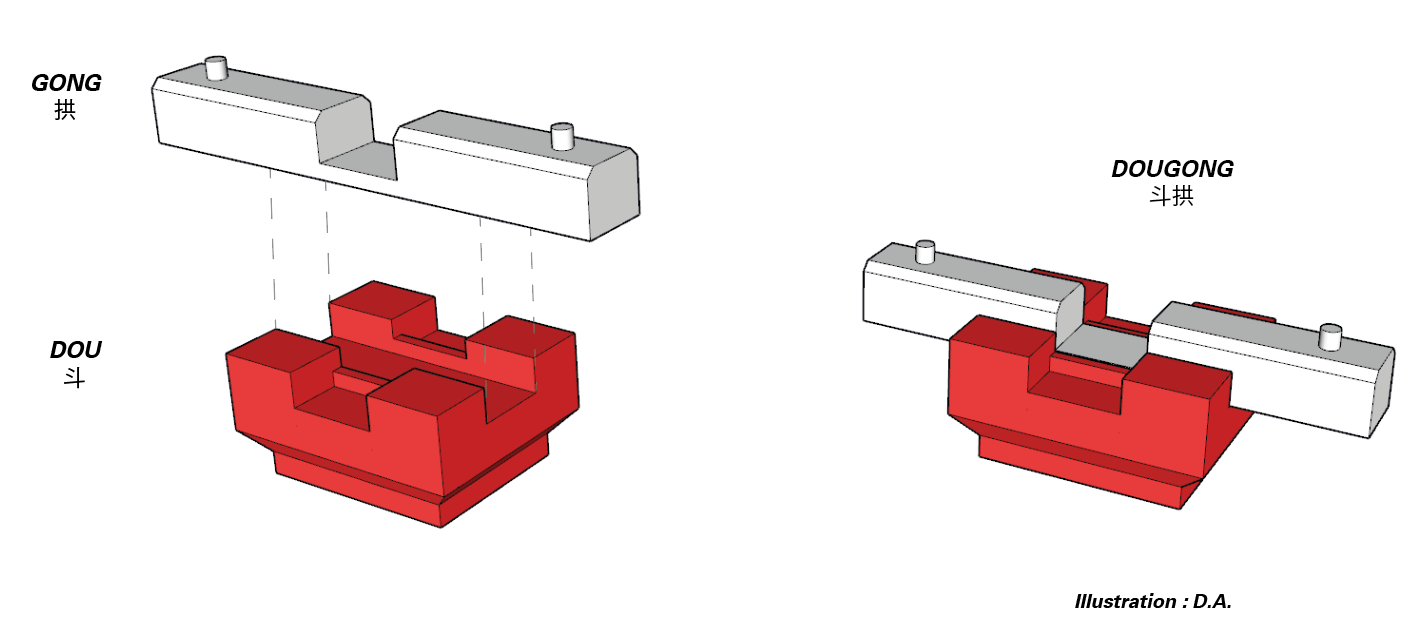 Le DOUGONG est un assemblage d’origine chinoise qui serait apparu les derniers siècles avant J.-C., puis se serait généralisé pendant la dynastie des Tang (618-907). Celui-ci est utilisé depuis près de 2500 ans dans la fabrication des temples, palais impériaux et reprend le principe d’assemblage par emboîtement sans clou ni colle.