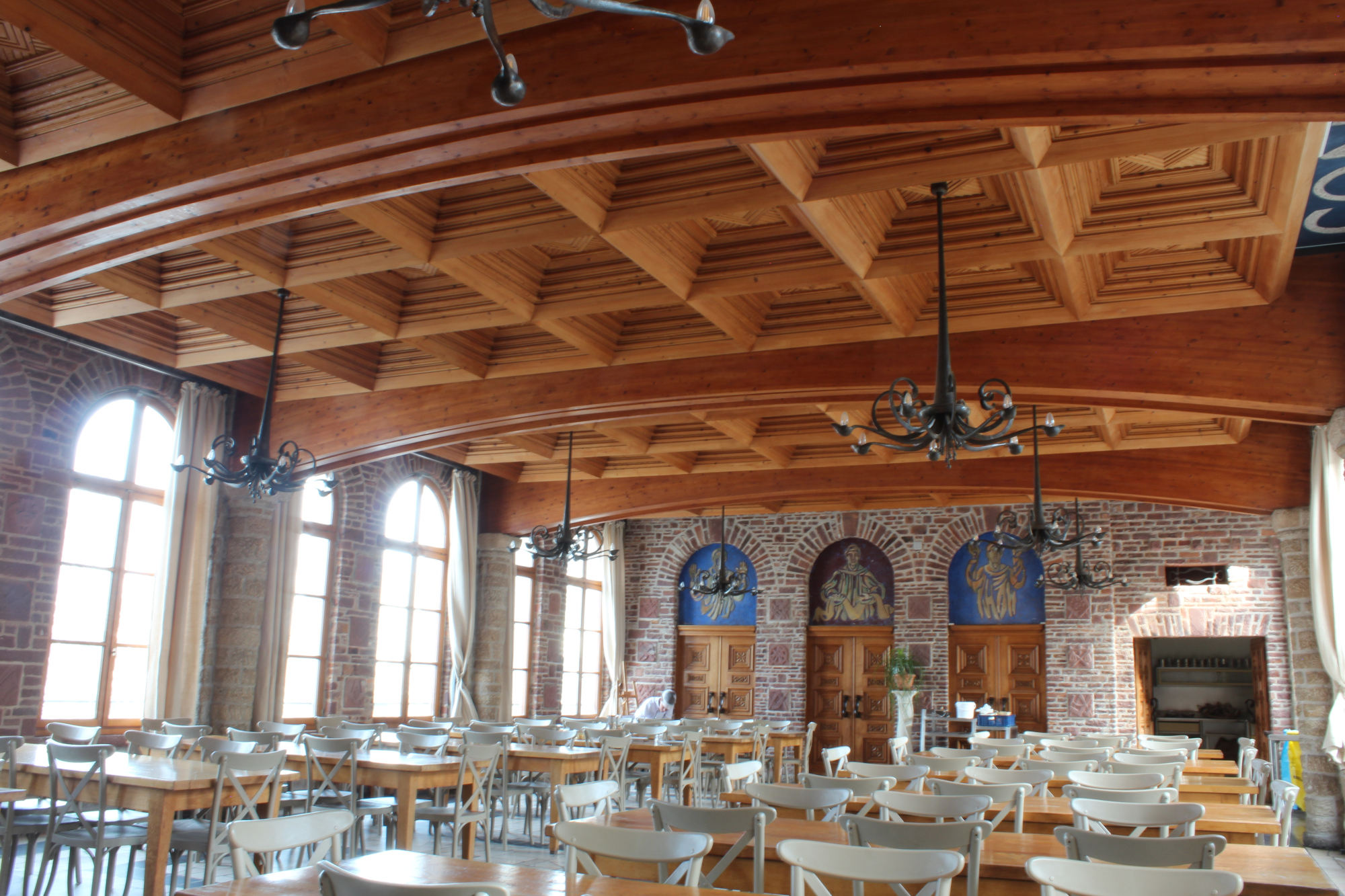 Cette salle à manger comprend un plafond à caisson dont le pourtour comporte l'inscription : "L'œuvre de la main est poésie du monde en qui l'âme féconde la matière d'une parcelle du trésor spirituel confiée à notre être"