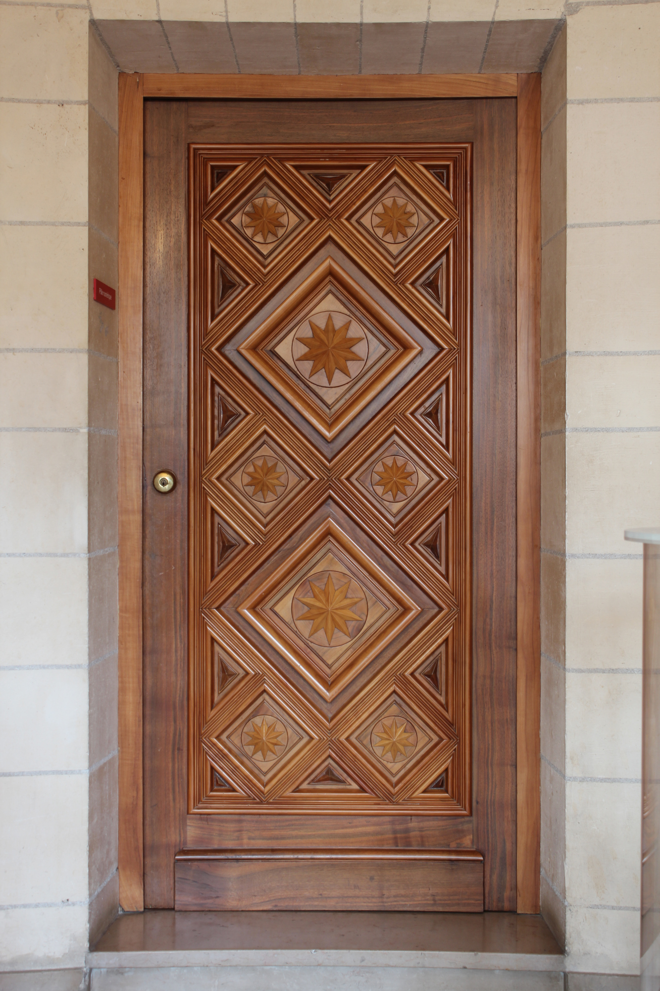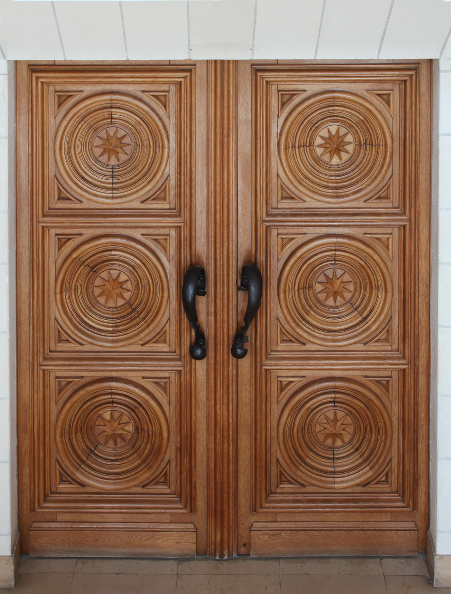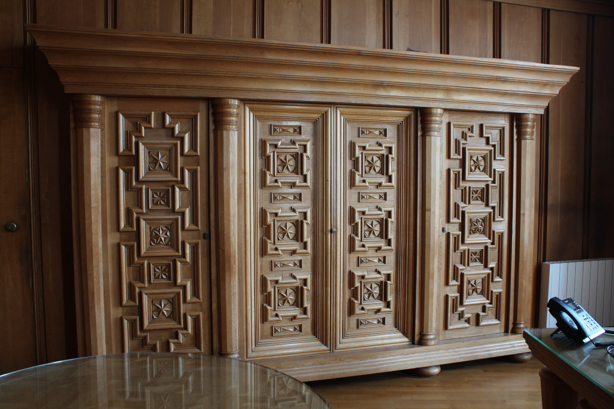 La porte de droite est une porte de la bibliothèque, elle est inspirée des armoires bretonnes dont les portes comportent des disques. Cette inspiration de Henri Favier, vient de ces armoires qui étaient présentes dans un musée de la ville. L'ensemble est en chêne ciré.