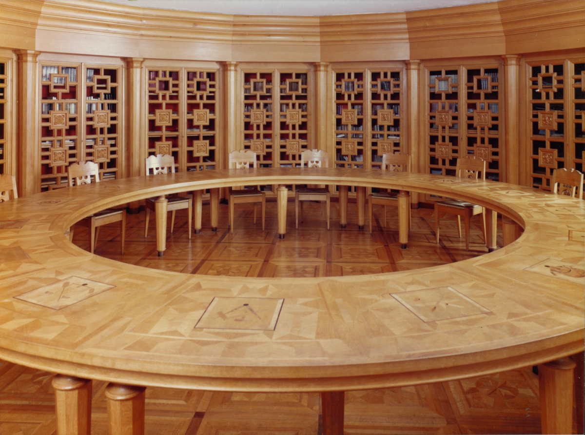 Cette bibliothèque est entièrement réalisée en chêne de Jupille de la forêt de Bercé pour un total de 10m3 de bois utilisé. Ce chantier a été exécuté du 1er septembre 1965 au 30 janvier 1971. Cinq personnes ont travaillé sur ces éléments totalisant 17 997 pièces de bois assemblés en 8 815 heures de travail. Les différents effets de coloris sur la table et le parquet sont possibles grâce à l'orientation du fil du bois des différentes pièces. Ce sont des panneaux arasés où chacune des pièces sont assemblées les unes avec les autres. Ces ouvrages sont cirés au naturel.
