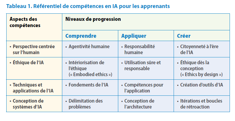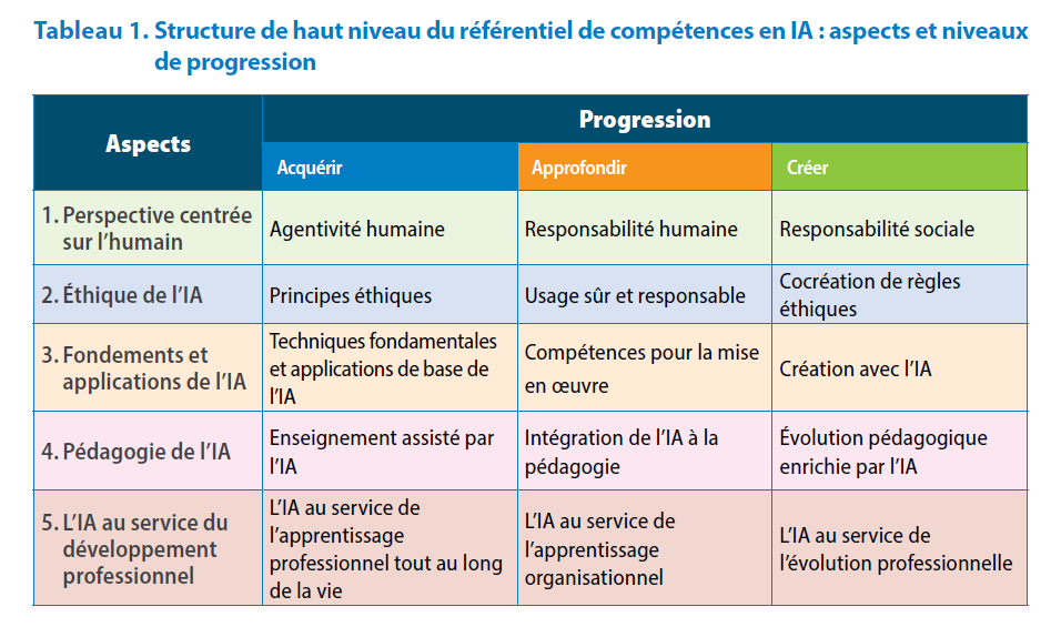 L’UNESCO appuie cette nécessité avec la publication, en février 2025, de deux référentiels de compétences visant à aider les pays à structurer un cadre de formation à l'IA pour l'éducation. Un référentiel pour les enseignants, l’autre pour les apprenants : ils encouragent tous deux une maîtrise progressive, du simple usage à la création de solutions avec l’IA, tout en insistant sur l’éthique, la perspective humaine et la compréhension des technologies sous-jacentes.