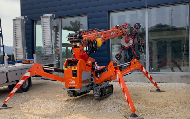 Pour faciliter la manutention, mis à part ces chariots à ventouses manuels ou télécommandés, des engins spécifiques sont utilisés sur le chantier surtout quand il s’agit de poser des vitrages très lourds ou quand les menuiseries se trouvent en hauteur. Par exemple, un système de ventouses peut être installé sur une mini grue “araignée” (photo 2), ou au bout d’une grue selon la portée nécessaire et l’environnement du chantier (veiller à l’accessibilité).