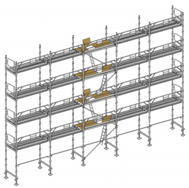 Pour les travaux en façade de grandes surfaces, avec des tâches répétitives comme le renouvellement de fenêtres d’un bâtiment collectif par exemple, l’utilisation d’un échafaudage de pied est à privilégier. Il permet de travailler plus confortablement, en toute sécurité et sans se soucier de l’autonomie énergétique d’un engin. Il offre également une plus grande surface de travail et la possibilité de couvrir une surface de façade plus importante s’il s’agit d’un échafaudage tubulaire multidirectionnel. Il s’assemble pour couvrir la zone souhaitée (photo 3). Il convient dans ce cas d’avoir un monte-matériaux permettant d’approvisionner chaque étage.
