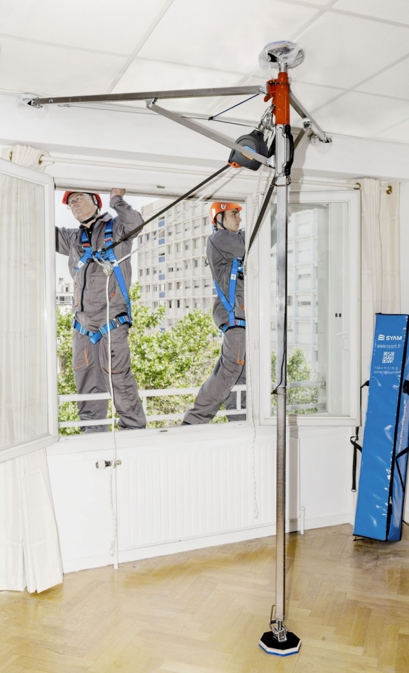 Pour des interventions ponctuelles de courte durée, non répétitives ou en cas d’impossibilité technique d’avoir recours aux protections collectives, il existe un système d’ancrage temporaire, développé par SYAM. Ce système d’ancrage mobile (photo 6) permet de créer un point d’ancrage en hauteur, excluant tout risque de chute (Facteur de chute 0) contrairement à un ancrage situé en dessous de l’opérateur. Le SYAM, simplement posé au sol et, de part et d’autre de l’ouverture, contre les murs, ne bouge absolument pas, garantissant à l’opérateur une sécurité absolue. Il est aussi très pratique car il se transporte dans un sac à dos, donc facilement transportable, s’installe rapidement et s’adapte à l’environnement dans lequel l’ouvrier doit intervenir. Une ou deux personnes peuvent s’attacher sans risque de chute à condition d’avoir les équipements ad hoc. Il n’exerce aucun effort au plafond et peut être utilisé sur tout type de support (faux plafond, plafond tendu, etc.). Le SYAM ne laisse aucune trace sur le lieu d’intervention car il ne nécessite aucun perçage et ne provoque aucune dégradation. C’est un véritable outil de travail permettant un confort supplémentaire à ses utilisateurs et ainsi une meilleure efficacité d’exécution. Sur le plan réglementaire, le personnel doit avoir suivi une formation. Le système d’une durée de vie de 10 ans maximum, doit être vérifié tous les ans par une personne habilitée ainsi que tous les équipements qui vont avec : harnais, verrous bloqueurs dit “stop chute”, mousquetons, cordes avec amortisseur de chute, etc. Une vérification visuelle est obligatoire avant chaque utilisation et il convient de toujours consulter la notice d’instructions du fabricant mise à disposition. De plus, en cas de chute, tous les accessoires ayant servi doivent être remplacés, en effet des micro-déchirures sur les harnais notamment ou sur les cordes peuvent les rendre dangereux lors d’une utilisation ultérieure.
