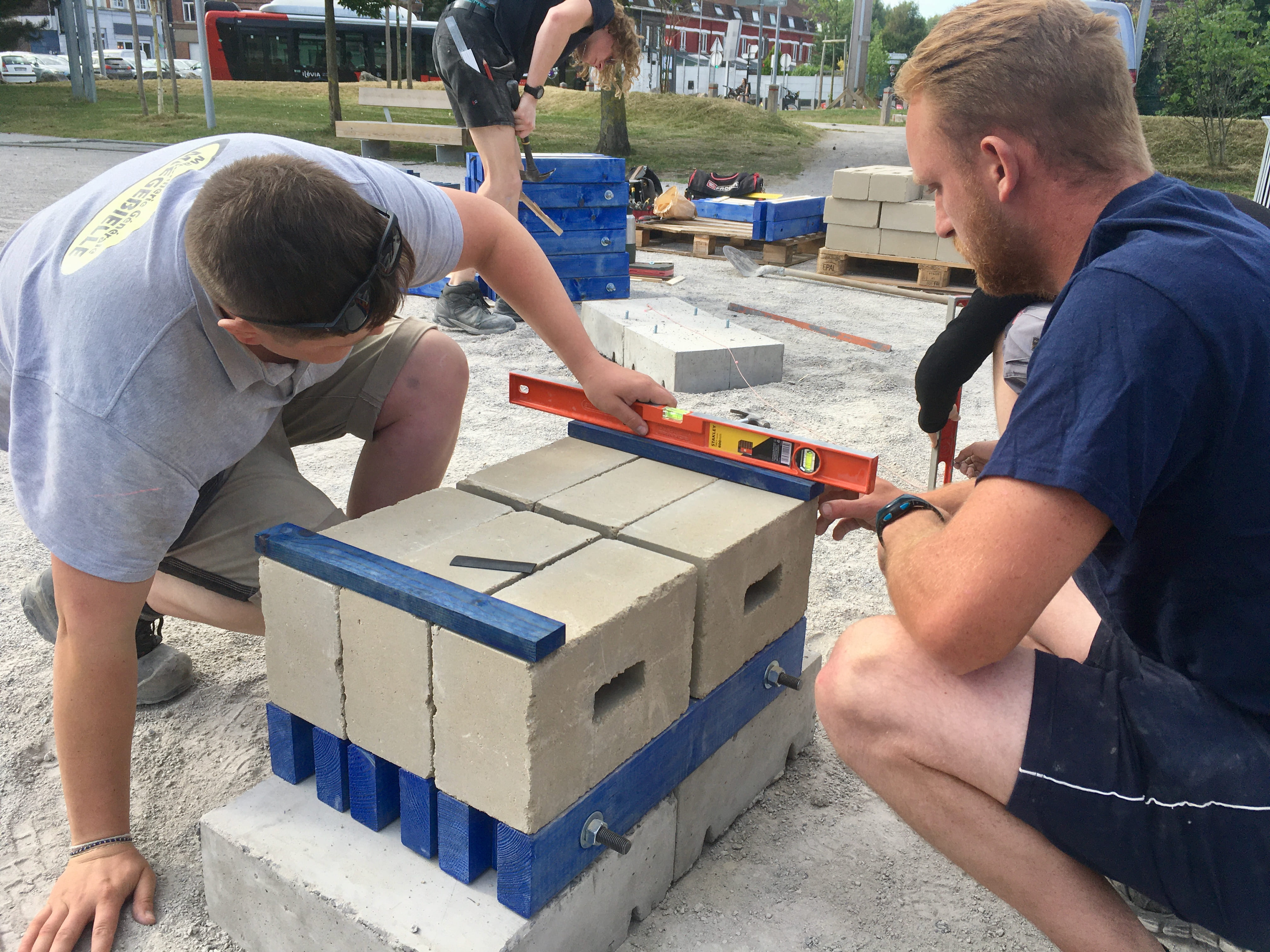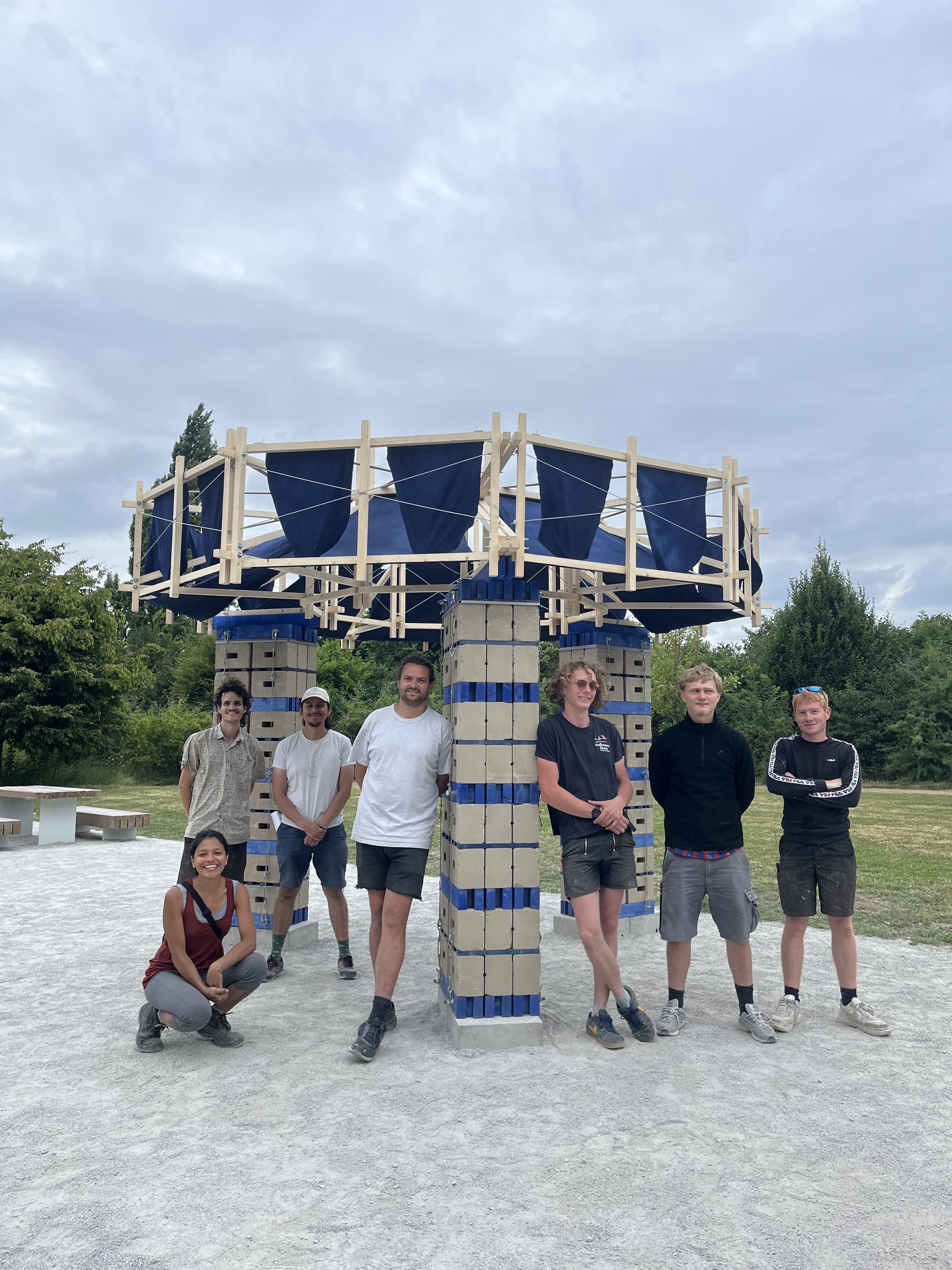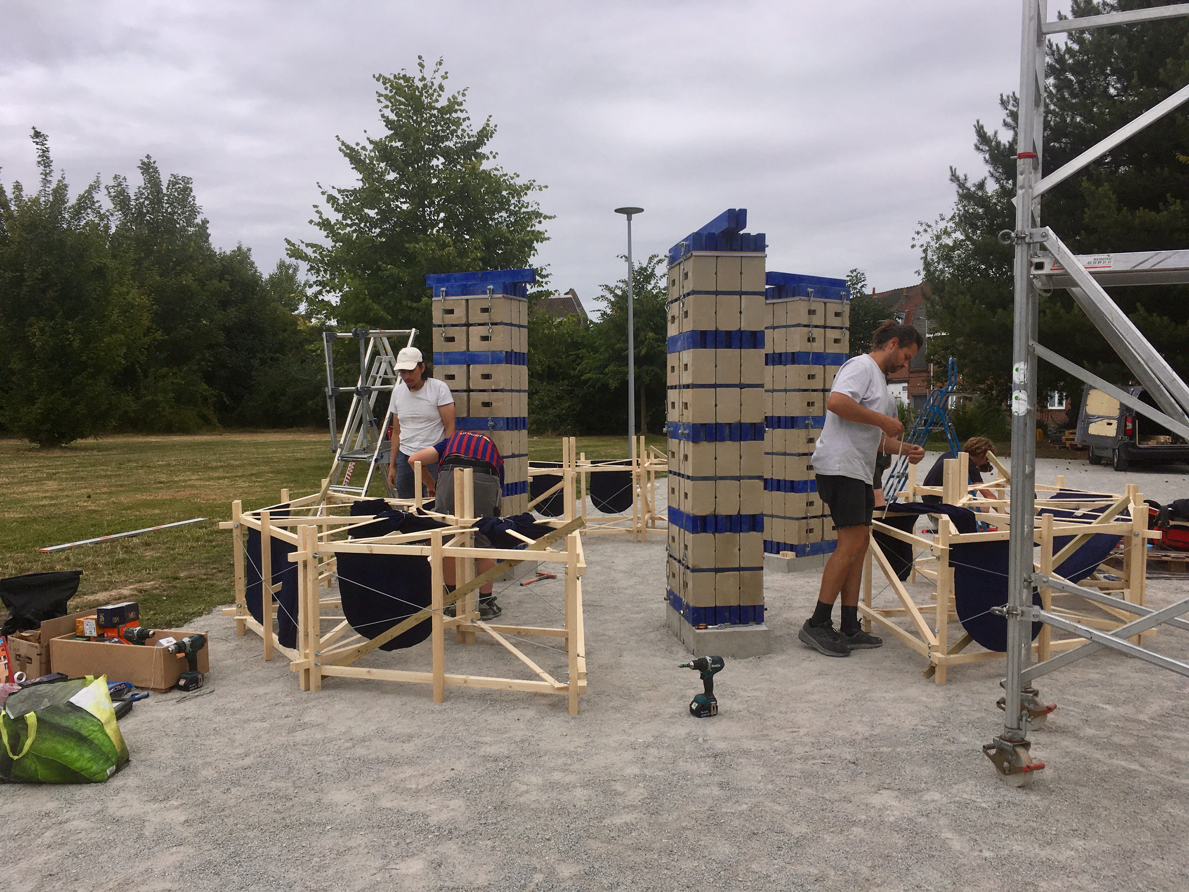 Pour la troisième année consécutive, une équipe de jeunes en formation chez les Compagnons du Devoir intègrent un collectif lauréat pour imaginer et fabriquer ensemble une cabane en briques de terre crue et en bois et tissus issus du réemploi. Ainsi, au collectif de quatre architectes, s'ajoutent deux maçons et trois charpentiers.